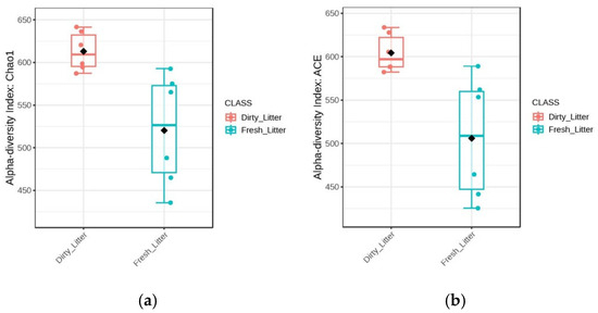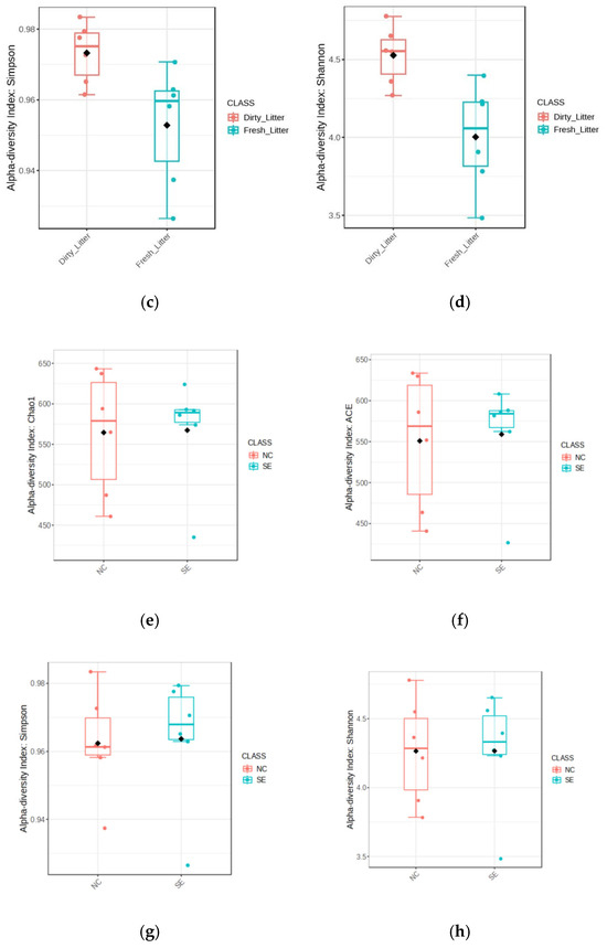 The alpha diversity of the cecal microbiota for both factors (litter type and Salmonella challenge) was calculated using chao1, ACE, and Simpson and Shannon indices. There was a significant difference (p < 0.05) in alpha diversity (Figure 3a–d) between the litter types, with higher diversity, species evenness, and richness in the dirty litter compared to the fresh litter, indicating that the use of dirty litter as a bedding material for chicks can increase the richness of the gut microbiota. However, Salmonella challenge exhibited no effect on species richness or evenness in the NC and SE groups (Figure 3e–h).