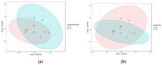 Principal coordinate analysis (PCoA) of microbiota based on Bray–Curtis index: (a) litter type effect (beta diversity p = 0.016); (b) Salmonella Enteritidis (p = 0.526). DL = Dirty litter, FL = Fresh litter, NC = nonchallenged, SE =Salmonella challenge.