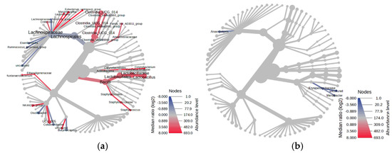 Comparative tree heatmap analysis between treatment groups (p < 0.05). (a) Dirty litter (DL) vs. fresh litter (FL), (b) Salmonella Enteritidis challenge (SE) vs. nonchallenged (NC).