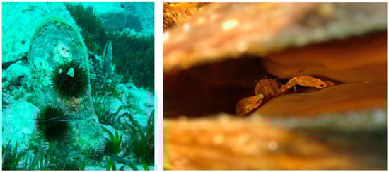 Pinna nobilis in Costa Paradiso (Northwest Sardinia) after MMEs in 2018. The figure depicts dead individuals scattered among rocks and seagrass (on the left), and with sea urchins (on the right), likely feeding on decomposing tissue and epibionts. Photo credit: Dr. Elisabetta Lutzu.