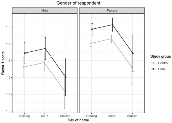 OTTTBs had significantly higher Factor 1 scores than control horses (t = 3.448; p < 0.001). As the E-BARQ items for Factor 1 were negatively worded, this finding indicates lower working compliance and responsiveness to deceleration signals in OTTTBs. Interactions between age and sex of horses and age and gender of respondents were not significant. The overall p-value for the sex of the horse was significant. However, pairwise comparisons of mare to gelding (t = −1.474; p = 0.304), stallion to gelding (t = 1.917; p = 0.134), and stallion to mare (t = 2.297; p = 0.057) failed to show significance. Female respondents reported significantly higher Factor 1 scores than male respondents (t = 3.786; p < 0.001). Given the negative wording of E-BARQ items, this indicates lower compliance and deceleration responsiveness in horses handled or ridden by female respondents (see Figure 1).