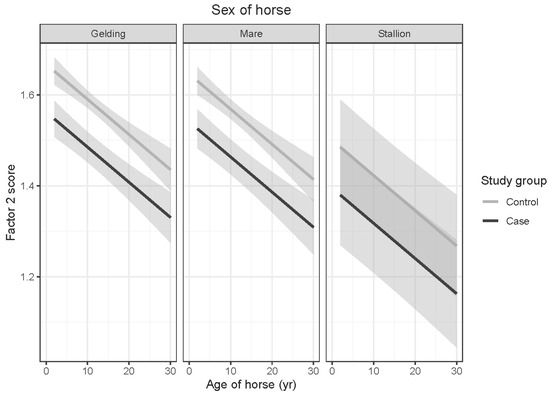 Predicted means with 95% confidence intervals form a linear model comparing case and control Factor 2 scores, shown by age of horse, for (left) geldings, (middle) mares, and (right) stallions. The lower scores obtained by case OTTTBs than control horses represent greater boldness and novel object confidence. The declining scores illustrate an age-related increase in boldness and novel object confidence for both case and control groups.