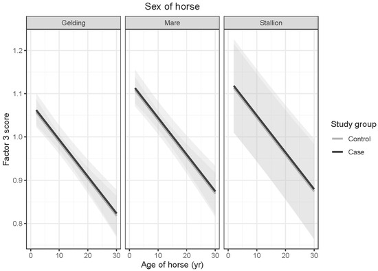 Predicted means with 95% confidence intervals form a linear model comparing case and control Factor 3 scores, shown by age of horse, for (left) geldings, (middle) mares, and (right) stallions. The declining scores illustrate an age-related increase in rideability and responsiveness to acceleration signals for both case and control groups.