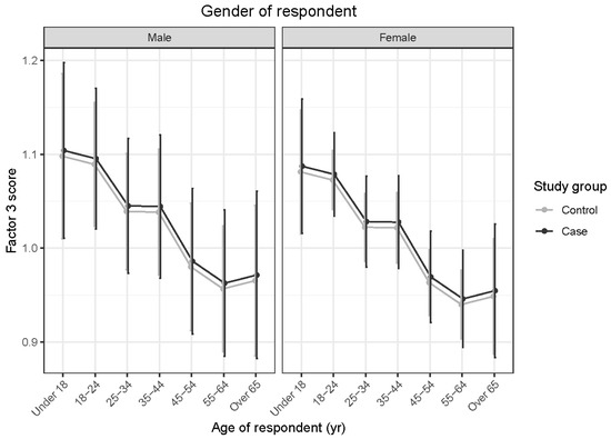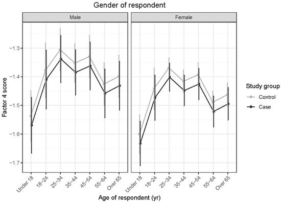 Predicted means with 95% confidence intervals form a linear model comparing case and control Factor 4 scores, shown by age of respondent, for (left) male and (right) female respondents. The higher scores obtained by respondents aged between 18 and 54 years, compared with those aged under 18 years, indicate greater trainability reported within the older age range. Likewise, the higher scores were obtained by 25–34-year-old than 55–64-year-old respondents.