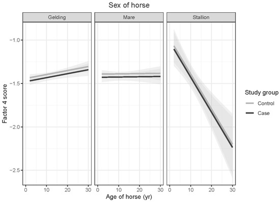Predicted means with 95% confidence intervals form a linear model comparing case and control Factor 4 scores, shown by age of horse, for (left) geldings, (middle) mares, and (right) stallions. No significant correlations were identified between the age or sex of the horse and trainability.