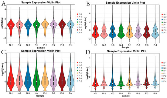 Violin plots illustrating gene expression. (A) mRNAs; (B) lncRNAs; (C) miRNAs; (D) circRNAs. Note. N-1 to N-4 represent the four mares in the non-pregnant group (Group N), while P-1 to P-4 represent the four mares in the pregnant group (Group P). The same nomenclature applies throughout.
