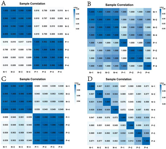 Heatmap showing the correlation among samples. (A) mRNAs; (B) lncRNAs; (C) miRNAs; (D) circRNAs.