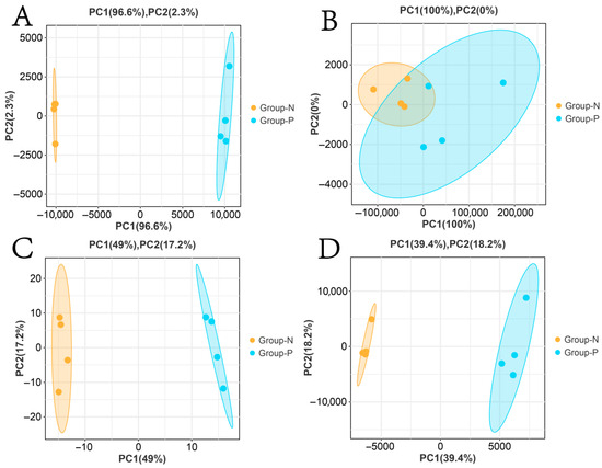 PCA clustering of Group N and Group P samples. (A) mRNAs; (B) lncRNAs; (C) miRNAs; (D) circRNAs.
