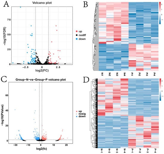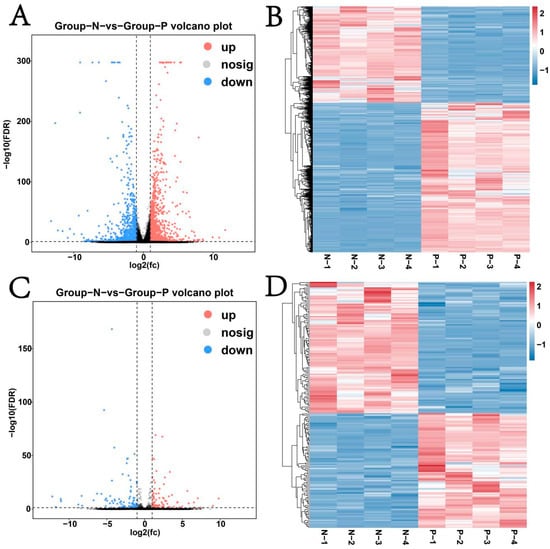 The volcano plot results showed that both mRNAs and lncRNAs had differentially expressed genes (Figure 4A,C). Among them, differential expression analysis identified 1300 significantly upregulated (p ≤ 0.05) mRNAs, including PIK3CG, CLEC4E, UBD, and SOD2 and 836 remarkably downregulated mRNAs, including H1-5, GUCY1B1, and C11H17 (Figure S1A). Similarly, 84 lncRNAs were obviously upregulated (p ≤ 0.05), and 96 were downregulated (Figure S1B). Heatmaps clearly differentiated the expression patterns of mRNAs and lncRNAs between Groups N and P (Figure 4B,D).