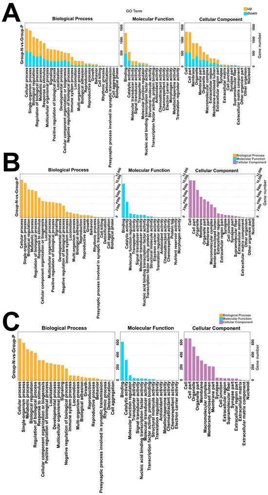GO enrichment analysis indicated that differentially expressed mRNAs are primarily enriched in pathways including the cellular process (BP), metabolic process, and biological regulation (Figure 6A). Similarly, differentially expressed miRNAs and circRNAs were also majorly enriched in these categories (Figure 6B,C).