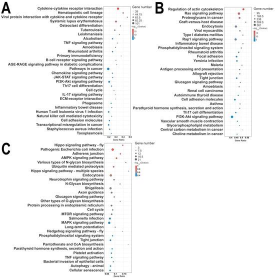 KEGG enrichment of differentially expressed mRNAs, lncRNAs, and circRNAs. (A) KEGG enrichment of mRNAs; (B) KEGG enrichment of LncRNA target genes; (C) KEGG enrichment of source genes of circRNAs. Note: GO enrichment results are illustrated in categorized histograms with the second GO item on the x-axis, and DEG counts on the y-axis. Red bars indicate upregulation, and green bars indicate downregulation. KEGG enrichment is shown as a bubble chart, highlighting the 20 pathways with the lowest Q-values. The y-axis represents pathways, the x-axis represents enrichment factors, the bubble size reflects gene number, and deeper red indicates a lower Q-value.