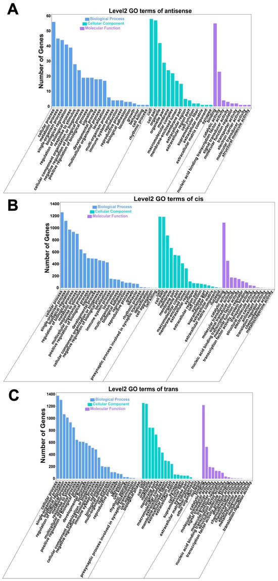 GO enrichment classification of antisense-related and cis/trans-regulated genes. (A) Histogram of antisense-associated GO enrichment categories; (B) Histogram of cis-regulated GO enrichment classification; (C) Histogram of trans-regulated GO enrichment classification.