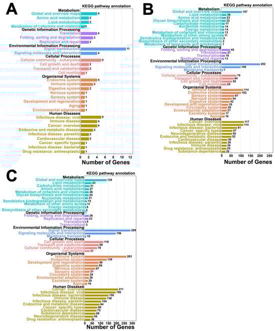 KEGG pathway enrichment analysis of antisense-associated and cis/trans-regulated genes. (A) Bar chart of antisense-associated KEGG pathway enrichment; (B) Bar chart of cis-regulatory KEGG pathway enrichment; (C) Bar chart of trans-regulatory KEGG pathway enrichment.