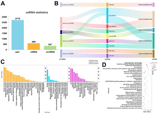 By integrating transcriptome sequencing data, a ceRNA regulatory network for Kazakh mares was analyzed, along with the competing regulatory relationship between circRNAs, miRNAs, and mRNAs. The results are shown in Figure 10A, where 2715 corresponding regulatory pairs were identified with 589 mRNAs and 347 circRNAs. Specifically, Figure 10B shows that multiple circRNAs, such as novel_circ_021623 and novel_circ_031245, competitively bind to miRNAs, including ca-miR-211 and eca-miR-424, thus regulating the expression of mRNAs such as ENSECAG00000017948 and ENSECAG00000001486. Furthermore, miR-147-x and miR-224-x were found to interact with multiple circRNAs and mRNAs. Additionally, mRNAs such as ENSECAG00000022441 and ENSECAG00000005506 were under the coregulation of various miRNAs.
