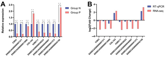 Validation of differentially expressed genes by RT-qPCR. (A) Log2 fold-change comparison between RNA-seq and RT-qPCR for differentially expressed genes; (B) Relative expression of differentially expressed genes by RT-qPCR. Note: In the figure, * * represents extremely significant.