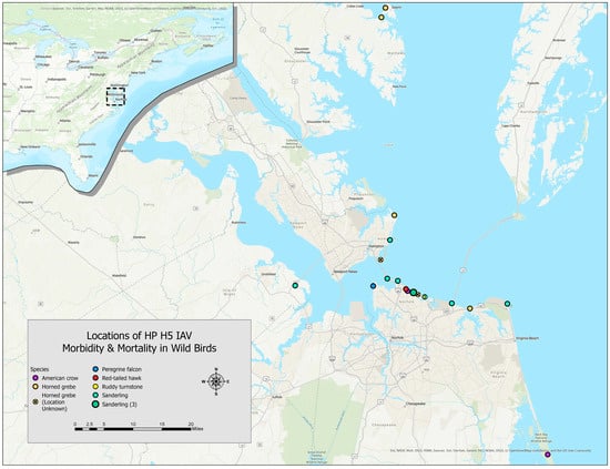 A wild bird mortality event from 7 to 29 March 2024, which lasted until mid-April 2024, spanned an area of ≥5652 km2, including multiple sites in four counties (Accomack, Mathews, Northumberland, and Middlesex) and three independent cities (Virginia Beach, Hampton, and Norfolk), primarily along coastal Virginia (Figure 1). Eleven sanderlings were among 34 wild birds collected after either being found dead or severely morbid and later died or were euthanized, with field estimates of hundreds of affected birds. Seven sanderlings were collected from Norfolk, two from Virginia Beach, and one from Hampton; the collection location of one sanderling was unspecified. Among the seven sanderlings observed while alive, some had neurologic signs (e.g., seizures). Carcasses or sick birds (later euthanized at rehabilitation clinics) were collected by members of the public, wildlife rehabilitator personnel/volunteers, or Virginia Department of Wildlife Resources personnel. Carcasses were stored at −20 °C for up to three weeks and submitted to the Southeastern Cooperative Wildlife Disease Study (SCWDS) at the University of Georgia (UGA) for diagnostic evaluation. Other species involved in this outbreak from which H5 IAV was detected include two American crows (Corvus brachyrhynchos), one ruddy turnstone, eight horned grebes (Podiceps auritus), one peregrine falcon (Falco peregrinus), and one red-tailed hawk (Buteo jamaicensis) (Figure 1).