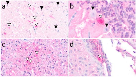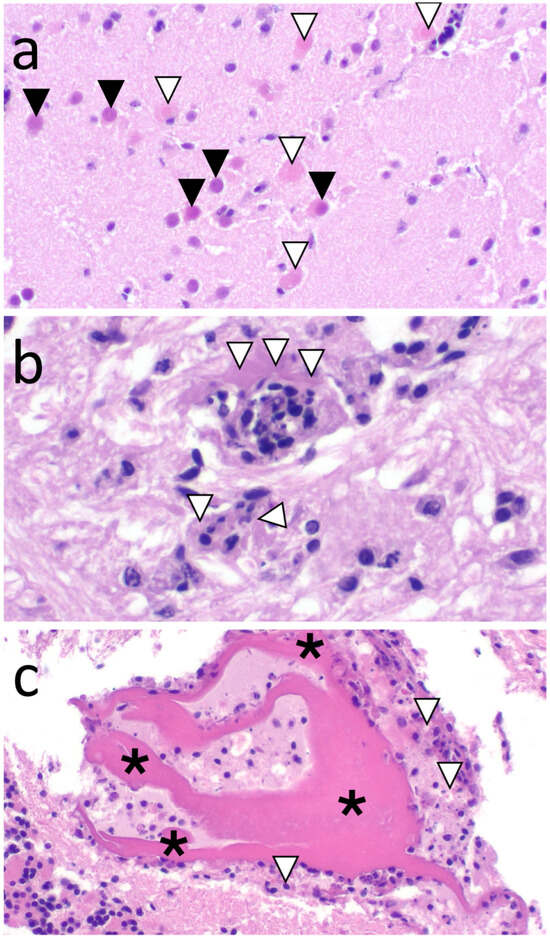(a) Cerebral neuronal necrosis (white arrowheads) and intranuclear inclusions (black arrowheads) in sanderling W24-190E (magnification 20×); (b) fibrinoid necrosis (white arrowheads) in two arterioles in the midbrain in sanderling W24-190H (magnification 40×); (c) fibrinoheterophilic meningitis (asterisks—fibrin; white arrowheads—heterophilic inflammation) over the cerebellum of sanderling W24-190D (magnification 20×). (a–c) Hematoxylin and eosin stain.