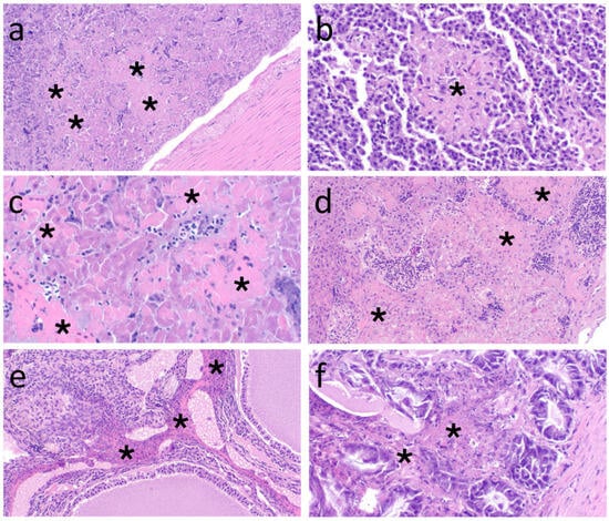(a) Acute, multifocal, pancreatic necrosis (asterisks) with adjacent artery (lower right) in sanderling W24-190J (magnification 10×); (b) acute, focal, splenic necrosis (asterisk) in sanderling W24-190B (magnification 40×); (c) acute, multifocal, hepatic necrosis (asterisks) in sanderling W24-190J (magnification 20×); (d) acute, multifocal, adrenal gland necrosis (asterisks) in sanderling W24-190B (magnification 10×); (e) acute, multifocal, necroheterophilic oophoritis (asterisks) in sanderling W24-190B (magnification 10×); (f) acute, multifocal, small intestinal lamina propria necrosis (asterisks) with glandular atrophy and necrosis in sanderling W24-190-B (magnification 20×). (a–f) Hematoxylin and eosin stain.