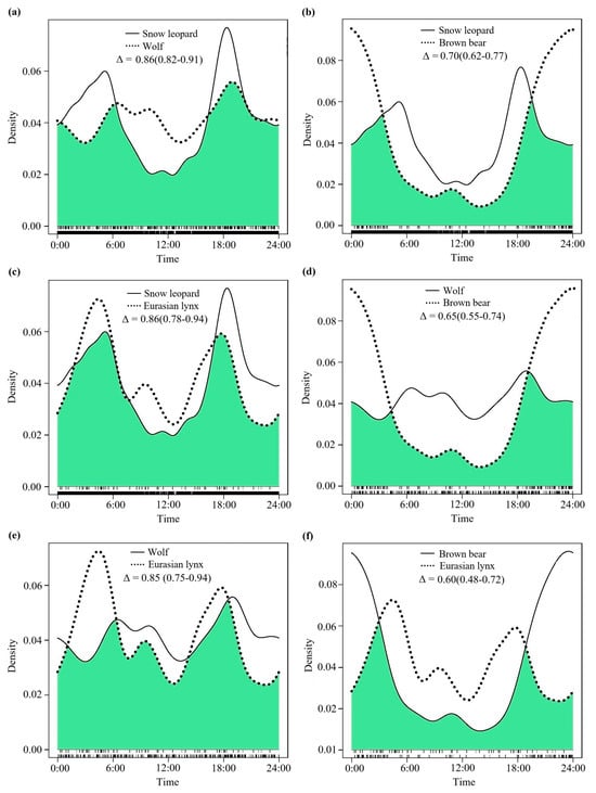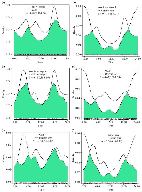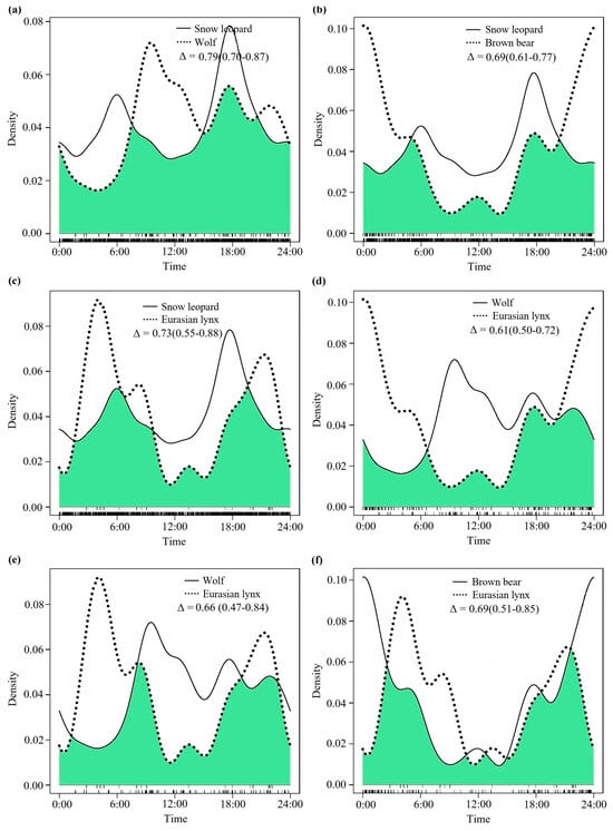 From the perspective of the cold season (Table 2), the diel activity rhythm curves of the pairwise species pairs between snow leopards and wolves (Δ = 0.86, 95% CI: 0.82–0.91, Figure 3a), snow leopards and Eurasian lynx (Δ = 0.86, 95% CI: 0.78–0.94, Figure 3c), and wolves and Eurasian lynx (Δ = 0.85, 95% CI: 0.75–0.94, Figure 2e) still exhibited high-density overlap. In comparison with the annual pattern, the degree of overlap in the diurnal activity rhythms between snow leopards and brown bears (Δ = 0.70, 95% CI: 0.62–0.77, Figure 3b), wolves and brown bears (Δ = 0.65, 95% CI: 0.55–0.74, Figure 3d), and brown bears and Eurasian lynx (Δ = 0.60, 95% CI: 0.48–0.72, Figure 3f) during the cold season shows a slight decline, yet all still fall within the range of moderate overlap.
