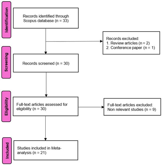 A comprehensive list of studies examining the use of hemp products in laying-hen diets was compiled in January 2025 from the Scopus database using search terms such as “hemp,” “seed,” “oil,” “cake,” and “hen,” combined with Boolean operators (AND/OR) without limiting publication years. Additionally, the reference lists of relevant articles were manually screened to identify further eligible studies. Studies involving other animal species or review articles were excluded. The study selection process is illustrated in Figure 1. The entirety of the database development process was in accordance with the Preferred Reporting Items for Systematic Reviews and Meta-Analysis (PRISMA) protocol [14]. The PRISMA checklist was used to ensure the inclusion of all relevant information in the analysis (Supplementary Materials Data S1).