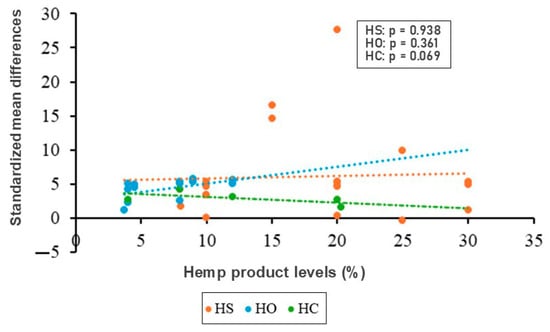 Meta-regression between C22:6n3 (DHA) and hemp product levels. HS (hempseed), HC (hempseed cake), and HO (hempseed oil) [5,6,7,8,25,26,27,28,30,31,33,34,37,38,39,40].