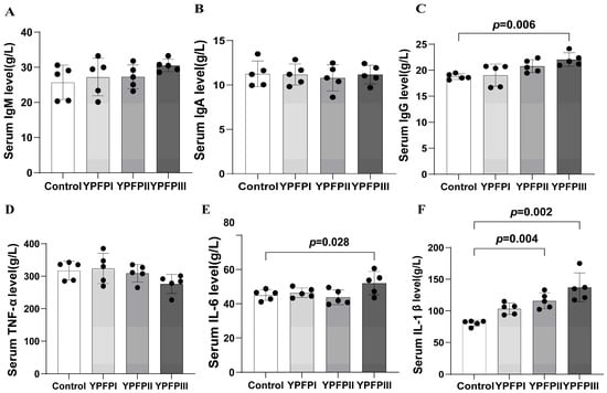 Effects of YPF-P treatment on immune level: (A) IgM, (B) IgA, (C) IgG, (D) TNF-α, (E) IL-6, and (F) IL-1β. Bars with different letters differ significantly (p < 0.05). Black dots represent individual sample sizes within each group (n = 5).