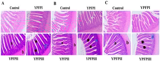 3.4. Influence of YPF-P on Duodenum, Jejunum, and Ileum Intestinal Morphology