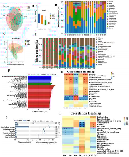 To assess the impact of YPF-P on the intestinal microbiota of goslings, cecal contents were subjected to 16S rRNA gene sequencing. As shown in the Venn diagram (Figure 3), a total of 9387 OTUs were detected in the cecal contents across all treatment groups, with 129 OTUs commonly shared among them. The Control, YPFPI, YPFPII, and YPFPIII groups contained 4733, 2958, 1887, and 1307 unique OTUs, respectively (Figure 3A). The Shannon index was significantly lower in the PFPIII group than in the Control (p < 0.05; Figure 3B), while β-diversity showed no significant group differences (Figure 3C). 16S rRNA sequencing revealed that the cecal microbiota at the phylum level was primarily composed of Firmicutes, Bacteroidota, Proteobacteria, and Actinobacteriota. YPF-P supplementation led to a shift in the cecal microbial composition, notably increasing the relative abundance of Firmicutes and Bacteroidota, while reducing Proteobacteria levels, especially in the YPFPIII group (Figure 3D).