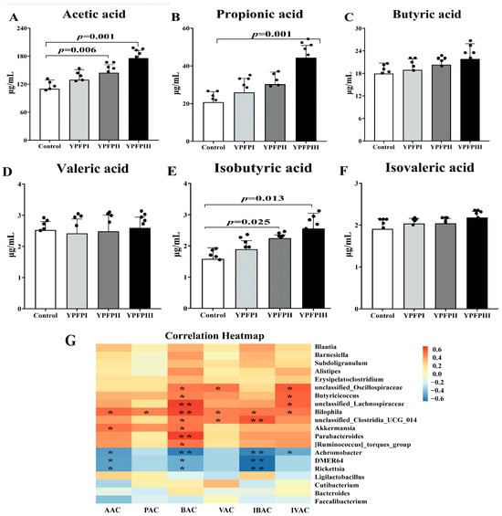 Effects of YPFP on SCFAs in cecum contents of goslings: (A) acetic acid, (B) propionic acid, (C) butyric acid, (D) valeric acid, (E) isobutyric acid, and (F) isovaleric acid. Black dots represent individual sample sizes within each group (n = 5). (G) Pearson correlation analysis between intestinal flora and short-chain fatty acids: (AAC) acetic acid, (PAC) propionic acid, (BAC) butyric acid, (VAC) valeric acid, (IBAC) isobutyric acid, and (IVAC) isovaleric acid. Black dots represent individual sample sizes within each group (n = 5). * indicates p < 0.05, ** indicates p < 0.01.