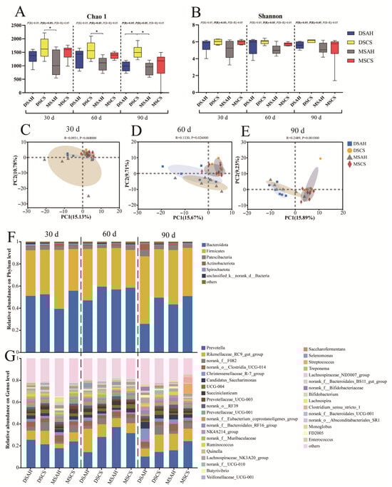 A total of 4,395,941 reads (1,839,388,682 sequences) were obtained after quality filtering and clustered into 50,253 amplicon sequence variants (ASVs) per sample. For the alpha diversity analysis, the CS diets’ Chao1 index was greater than the AH diets’ at 30, 60, and 90 days (p < 0.05) (Figure 1A). Additionally, Dumont sheep had a higher Chao1 index than that of the Mongolian sheep (p < 0.05), but no difference was observed in the Shannon index among the four treatment groups (Figure 1B). The PCA score map showed that the separation distance between the bacterial communities in the AH and CS groups gradually widened as the experiment progressed, but the impact of the sheep breed resulted in mostly overlapping distributions in regard to the different experimental dates (Figure 1C–E).