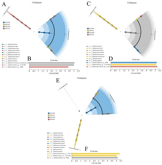 The rumen bacterial biomarkers (genera level) with a linear discriminant analysis (LDA) score > 2.0, using LEfSe analysis. (A,B) A cladogram and LEfSe bar chart at 30 days of the experiment. (C,D) A cladogram and LEfSe bar chart at 60 days of the experiment. (E,F) A cladogram and LEfSe bar chart at 90 days of the experiment, a–m represents distinct bacterial taxonomic units. DSAH: Dumont sheep fed alfalfa hay, DSCS: Dumont sheep fed corn stalk, MSAH: Mongolian sheep fed alfalfa hay, MSCS: Mongolian sheep fed corn stalk, n = 6.
