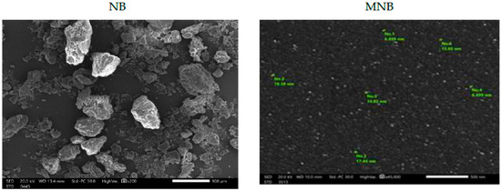 Figure 1 illustrates the surface morphology differences between NB and MNB by SEM analysis. NB showed aggregated particles with irregular shapes and a rough, non-uniform surface. In contrast, modified MNB exhibited well-dispersed, individually separated nano-particles that were smaller, were more uniformly distributed, and presented a smoother surface morphology.