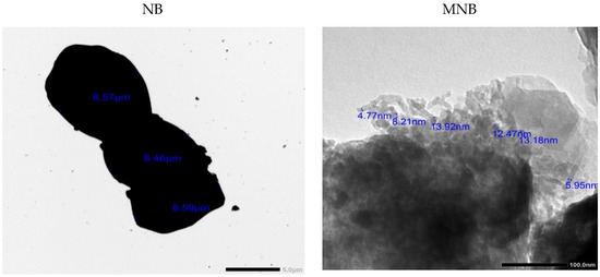 Figure 2 shows the TEM images of NB and MNB. The TEM micrographs revealed the internal structure and nanoscale features of NB and MNB. MNB particles exhibited a well-defined, nanoscale morphology, with particle sizes ranging from 4.77 to 13.92 nm. In contrast, TEM analysis indicated NB in a highly agglomerated form, with larger, irregular clusters compared to MNB.