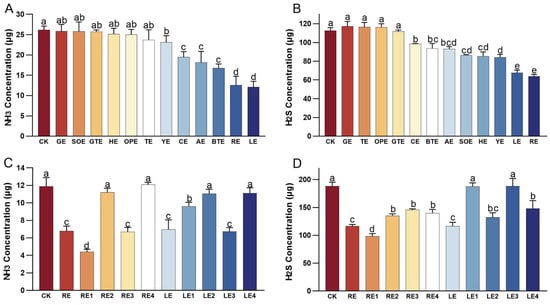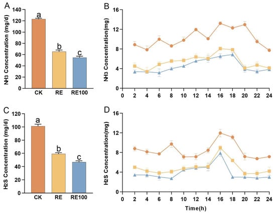 Emissions of NH3 and H2S from different treatment groups in the feeding test. (A) NH3 emissions from different treatment groups during the feeding test. (B) Temporal trends in NH3 emissions among different treatment groups during the feeding test. (C) H2S emissions from different treatment groups during the feeding test. (D) Temporal trends in H2S emissions among different treatment groups during the feeding test. Error bars represent the standard error of the mean (n = 3). Different letters above the bars indicate statistically significant differences between treatments (ANOVA and Duncan test, p < 0.05).