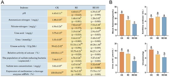 Serum concentrations of uric acid, urea, and ammonia are important indicators of nitrogen metabolism [39]. Inhibition of xanthine oxidase, a key enzyme in uric acid synthesis, can reduce uric acid production and help regulates ammonia metabolism. In this study, compared with the CK group, both the RE and RE100 groups significantly reduced blood ammonia (37.53 ± 1.28 μmol/L, 26.92 ± 1.78 μmol/L, 19.94 ± 0.78 μmol/L, p < 0.05) and urea concentrations (6.33 ± 0.21 mmol/L, 4.96 ± 0.17 mmol/L, 4.20 ± 0.42 mmol/L, p < 0.05). Additionally, the RE100 group significantly reduced uric acid concentration (14.19 ± 0.67 μmol/L, 12.90 ± 0.93 μmol/L, 7.85 ± 0.92 μmol/L, p < 0.05) in the British shorthair cats (Figure 3B). Although both RE and RE100 groups also reduced xanthine oxidase activity, the differences were not statistically significant (5.24 ± 0.42 U/L, 5.11 ± 0.09 U/L, 4.83 ± 0.28 U/L, p > 0.05).