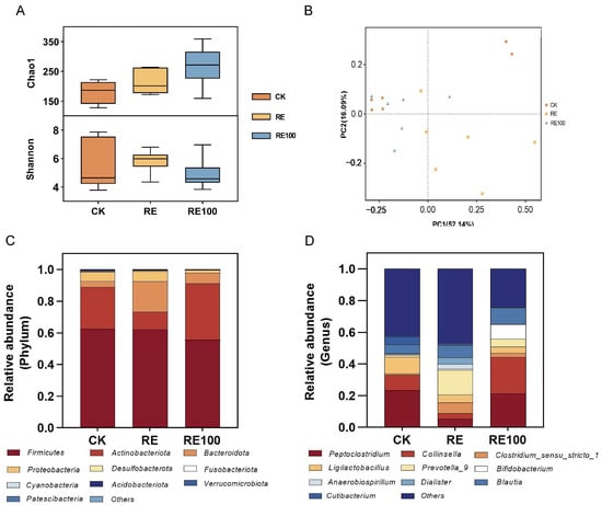 This study employed 16S rRNA sequencing to evaluate the abundance and structure of the microbiome under various treatments. The α-diversity of the microbiome in fresh feces is shown in Figure 4A. The Chao1 index values were as follows: CK (180.49 ± 19.56), RE (216.36 ± 19.62), and RE100 (268.49 ± 66.74). For the Shannon index, the values were CK (5.46 ± 0.71), RE (5.84 ± 0.33), and RE100 (4.88 ± 0.44). Intergroup differences in both the Chao1 and Shannon indices were not statistically significant (p > 0.05). PCoA based on weighted UniFrac distances was used to assess bacterial β-diversity (Figure 4B), and the results showed that microbiota composition differed among treatment groups.