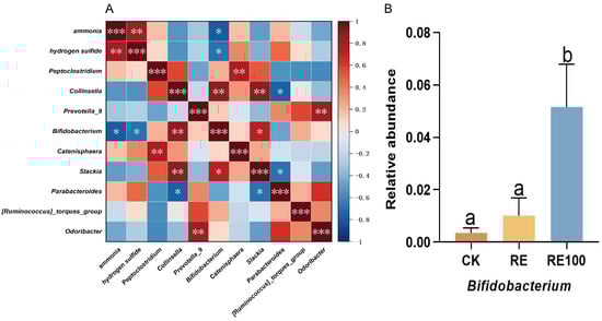 Spearman correlation network analysis was conducted to investigate the associations between ammonia and hydrogen sulfide emissions and bacterial genera. Among the genera with significant changes in relative abundance, four were positively correlated, while five were negatively correlated with ammonia and hydrogen sulfide emissions (Figure 5A). Notably, a significant negative correlation was observed between Bifidobacterium and both gases. Although the relative abundance of Bifidobacterium was higher in the RE group than in the CK group, the difference was not statistically significant (p > 0.05). In contrast, the RE100 group exhibited a significantly higher relative abundance of Bifidobacterium compared to both the CK and RE groups (p < 0.05; Figure 5B).