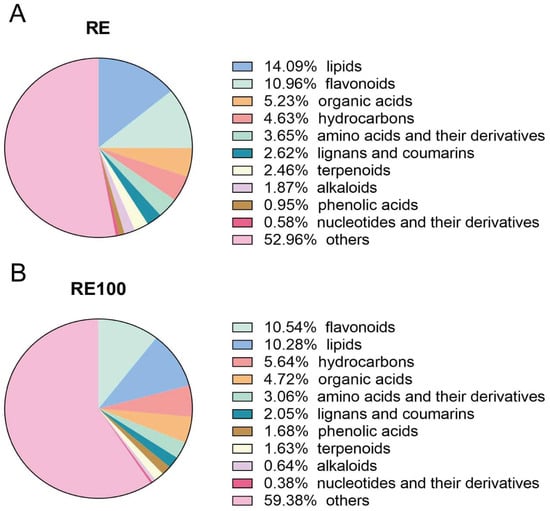 Classification of chemical compositions in rosemary extracts. (A) Chemical composition categories identified in the RE group. (B) Chemical composition categories identified in the RE100 group.