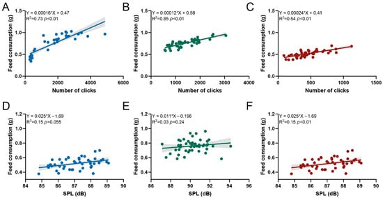 Relationships between feed consumption and both the number of clicks (A–C) and sound pressure level (SPL, in dB) (D–F) within 30 min after pellet feeding, under different temperatures, ammonia nitrogen concentrations, and nitrite nitrogen concentrations.