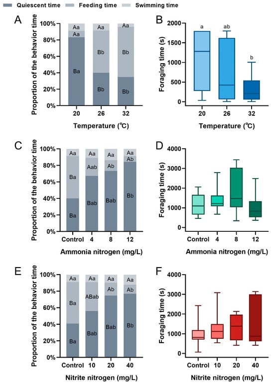 Proportion of behavior time and the foraging time of P. vannamei under different temperatures (A,B), ammonia nitrogen concentrations (C,D), and nitrite nitrogen concentrations (E,F). Different uppercase letters indicate significant differences between behaviors within the same treatment (p < 0.05), while different lowercase letters indicate significant differences in the same behavior across treatments (p < 0.05).