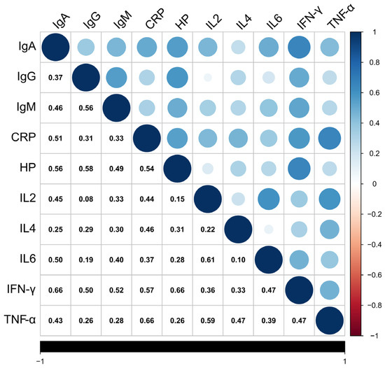 The IgA (MB-4907A), IgG (MB-4616A), IgM (MB-4908A), CRP (MB-2161B), HP (MB-2158B), IL2 (MB-4923B), IL4 (MB-4904B), IL6 (MB-4905B), IFN-γ (MB-4902B), and TNF-α (MB-4838B) assay kits from Jiangsu Meibiao Biotechnology Co., Ltd., Nanjing, China, were used for measurements, following the double-antibody, one-step sandwich method. After equilibration at room temperature for 20 min, the required strips were removed from the aluminum foil pouch, and the remaining strips were resealed in a zip-lock bag and stored at 4 °C. Standard wells and sample wells were set up, with 50 μL of standards at various concentrations to each standard well. For the sample wells, 10 μL of test sample was added, followed by 40 μL of sample diluent, while the blank wells were left empty. Then, 100 μL of horseradish peroxidase (HRP)-conjugated detection antibody was added to each standard and sample well. The plate was covered with a sealer and incubated at 37 °C for 60 min. After incubation, the liquid was discarded and the plate was blotted dry with absorbent paper. Each well was completely filled with Wash Solution, allowed to stand for 1 min, and then emptied and blotted dry. This washing step was repeated five times. Next, 50 μL of both Chromogen Solution A and Chromogen Solution B was added to each well, gently mixed, and incubated at 37 °C for 15 min in the dark. Then 50 μL of Stop Solution was added to each well, causing the color to change from blue to yellow. If the color appeared green or uneven, the plate was gently tapped to ensure thorough mixing. The Optical Density (O.D.) of each well was measured at 450 nm using a microplate reader within 15 min. Finally, a standard curve was constructed by plotting the standard concentrations on the x-axis and the corresponding O.D. values on the y-axis in Excel. A linear regression curve was generated, and its equation was used to calculate the concentration of immune markers in each sample.