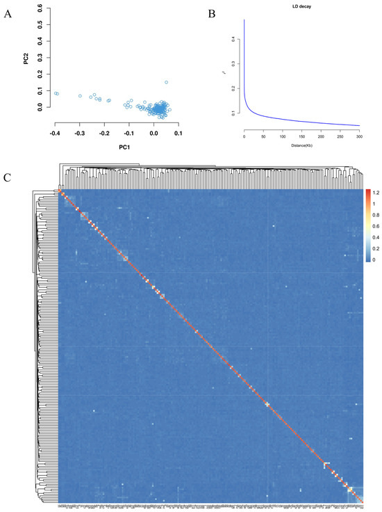 Principal component analysis (PCA) was conducted on the filtered SNP data by using Plink (version 1.90). The extracted significant feature vectors were utilized for mapping to observe individual clustering trends. To assess relatedness, we calculated the relatedness matrix among all samples by using the VanRaden algorithm implemented in GCTA (version 1.93) [31]. Linkage disequilibrium (LD) decay was analyzed using PopLDdecay (version 3.42) [32] to determine the LD coefficient (r2) for paired SNPs.