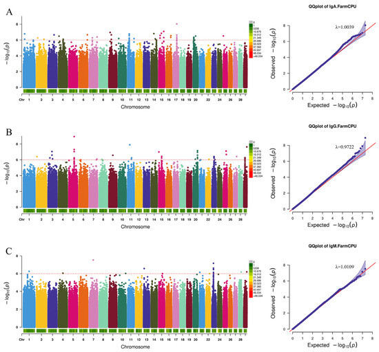 Manhattan and QQ plots of humoral immune correlations. (A) Immunoglobulin A, (B) Immunoglobulin G, and (C) Immunoglobulin M. The red dashed line is the threshold of −log10 (p-value), and points beyond the threshold range are significantly correlated sites.