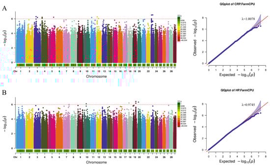 Manhattan and QQ plots related to inflammation indicators. (A) C-reactive protein, (B) Haptoglobin. The red dashed line is the threshold of −log10 (p-value), and points beyond the threshold range are significantly correlated sites.