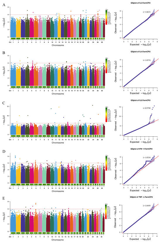 By analyzing the detected SNPs in relation to humoral immunity, inflammatory indicators, and cytokines, we successfully identified several genetic markers and candidate genes that are closely associated with the target traits. As illustrated in the QQ plots (Figure 3, Figure 4 and Figure 5) and the genomic inflation factors (λ = 0.97–1.06), no population stratification was observed.