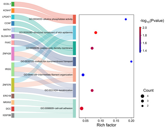 To further investigate the functional and regulatory relationships of these significant SNP markers and their respective candidate genes, we conducted a functional enrichment analysis of 125 genes by using the GO and KEGG databases. The GO analysis revealed seven significantly enriched functional terms (p < 0.05): cell–cell adhesion (GO:0098609), keratinization (GO:0031424), intermediate filament organization (GO:004510), sodium ion transmembrane transport (GO:0035725), postsynaptic density membrane (GO:0098839), structural constituent of skin epidermis (GO:0030280), and alkaline phosphatase activity (GO:0004035). The corresponding genes are presented in Figure 6 and Supplementary Table S4. In the KEGG enrichment analysis, only one significant pathway, the TGF-beta signaling pathway, was identified (Supplementary Table S5), with the enriched genes in this pathway including THSD4 and RPS6KB1.
