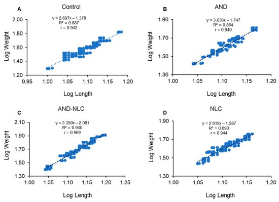 3.7. Effects of Experimental Diets on Length–Weight Relationship and Growth Pattern