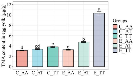 The TMA content of the egg yolks across the different groups is shown in Figure 1. The TMA content of the egg yolk was significantly lower in the C_AA group (3.16 ± 0.06 μg/g) than in the C_TT group (3.83 ± 0.11 μg/g; p < 0.05). Nonetheless, the TMA content of the egg yolk did not significantly differ between the C_AT (3.39 ± 0.10 μg/g) and C_TT groups or between the C_AT and C_AA groups. Moreover, all experimental subgroups (E_AA: 3.27 ± 0.11 μg/g; E_AT: 4.77 ± 0.08 μg/g; E_TT: 10.35 ± 0.34 μg/g) exhibited significant differences in the TMA content of the egg yolk (p < 0.05). Additionally, compared with their corresponding genotypes in the control group, the TMA content of the egg yolk significantly increased (p < 0.05) in the E_TT and E_AT groups, whereas that in the E_AA group did not exhibit any significant difference.