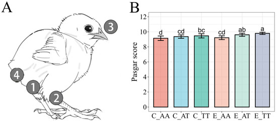 The Pasgar score evaluation in chicks. (A) Pasgar Scoring Schematic for Chicks. 1. Navel; 2. Legs; 3. Beak; 4. Belly. (B) Comparison of chick quality Pasgar scores among different groups. Bars labeled with different letters indicate significant differences (p < 0.05). The data are presented as mean ± SE.