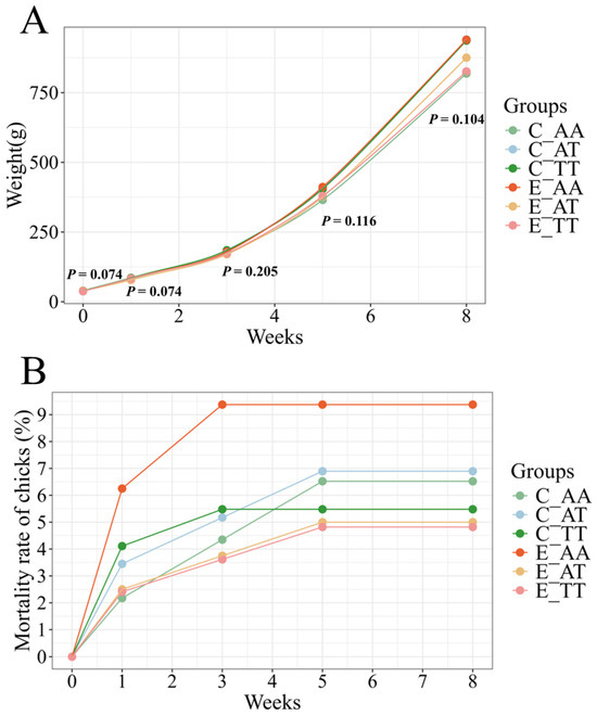 The growth performance of chicks. (A) Growth curves of chicks in the first 8 weeks. (B) The chick mortality rate in the first 8 weeks.
